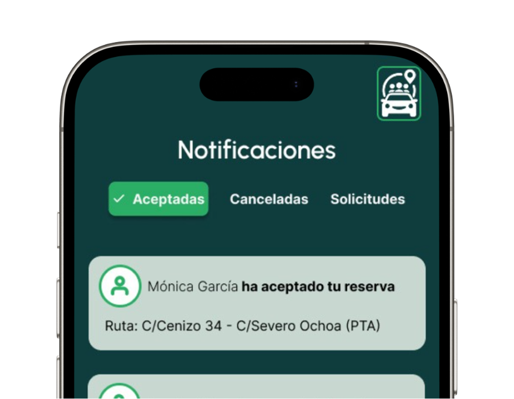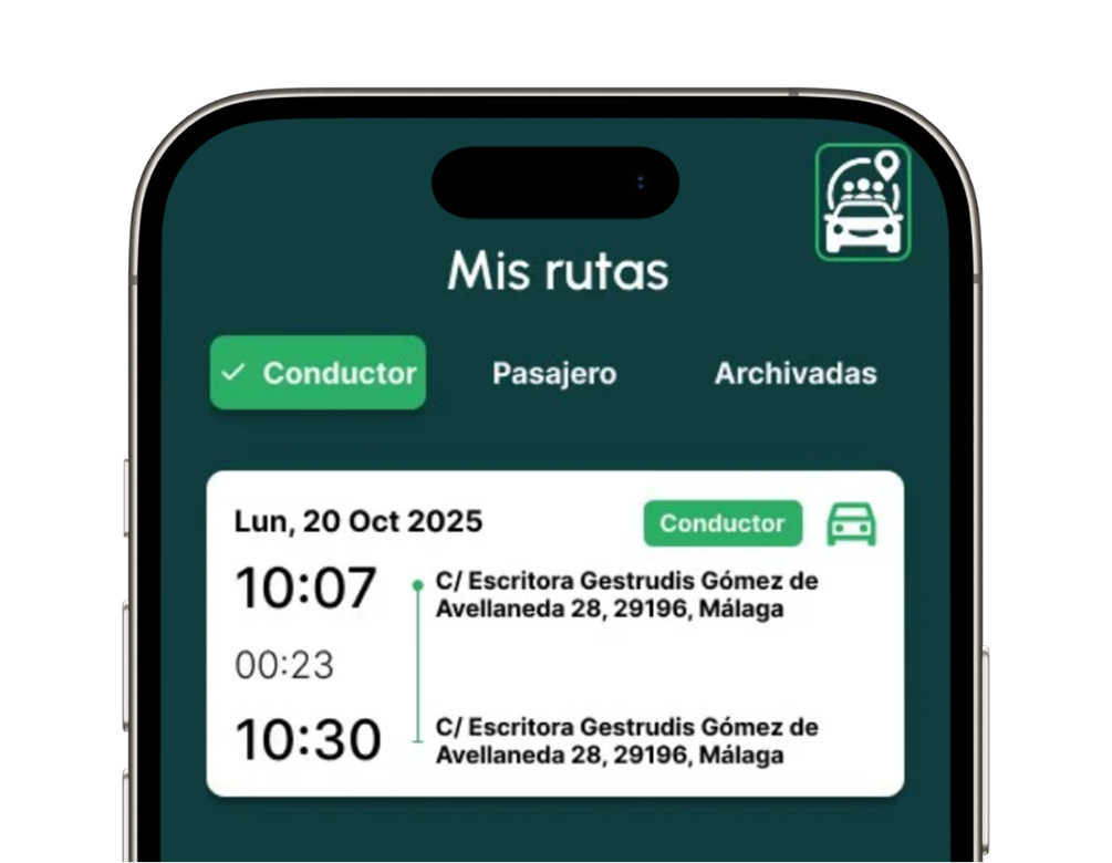 Málaga TechPark Conecta te permite compartir coche de forma segura y sencilla. Crea tu ruta, encuentra compañeros con trayectos similares y reduce costes y emisiones.